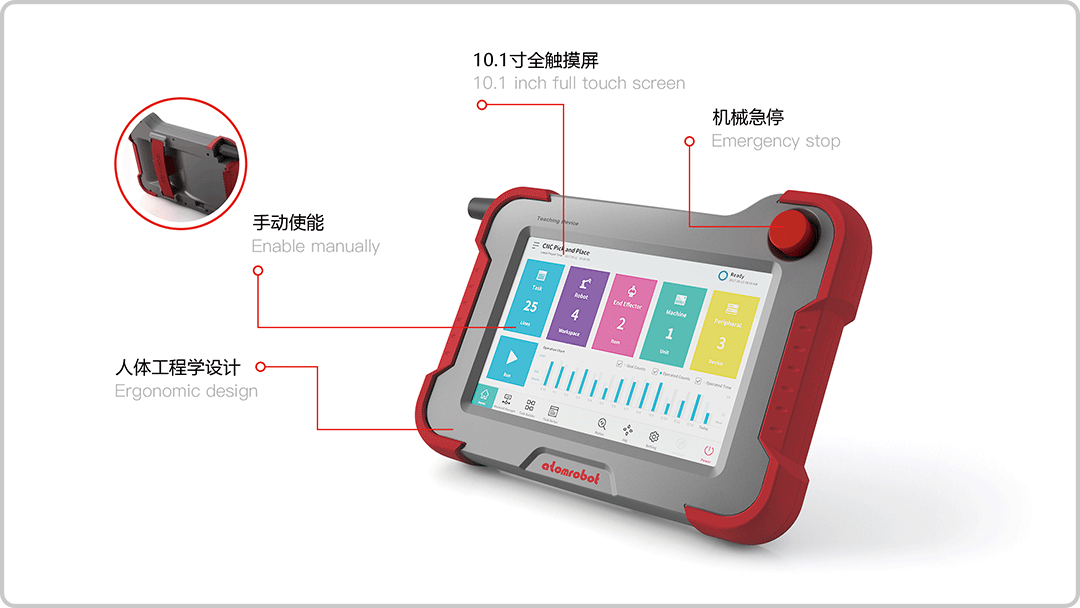 一切盡在掌握中:10.1寸觸摸屏設(shè)計(jì),最大化顯示機(jī)器人操作的相關(guān)信息。物理急停和使能按鍵設(shè)計(jì),更大限度的保護(hù)操作工程師的安全。輕量化的選材,為操作工程師提供更體貼的關(guān)懷。符合實(shí)際應(yīng)用場(chǎng)景的操作界面,最大限度的解放工程師的雙手。