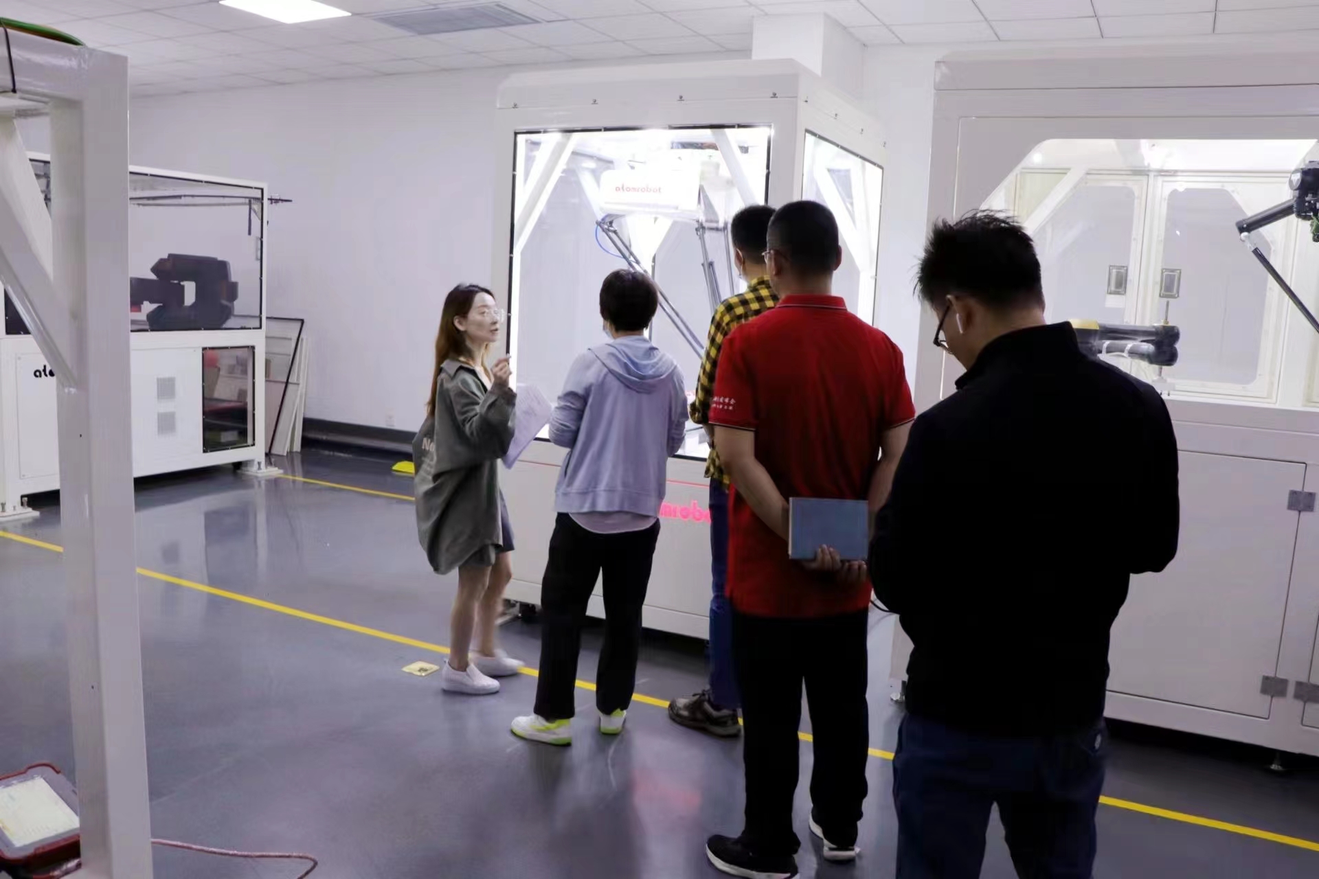 隨后,公司技術人員向探訪團們現(xiàn)場演示基于視覺系統(tǒng)+本機技術+控制器多種智能技術協(xié)同之下的多品類物料劃分、疊料精準識別抓取等智能作業(yè),并通過手工VS機械對比,形象展示了“用機器人造機器人”的多款提質(zhì)工裝設備。在這場“秀”的生動透視中,阿童木機器人“用技術解放雙手”的使命內(nèi)涵被生動、形象地娓娓道來。